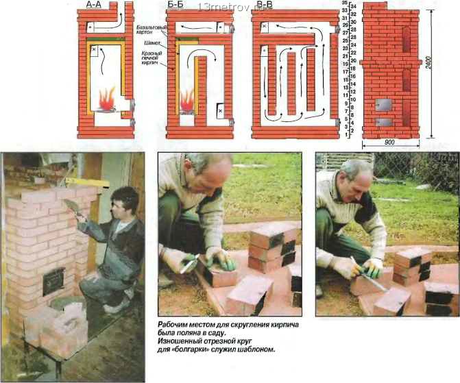 Главная » Публицистика 0 1 2 3 4 ... 11 троим и ремонтирует ПЕЧЬ - СООРУЖЕНИЕ ИНЖЕНЕРНОЕ Эта история известна мне не понаслышке. Мы с друзьями вот уже более десяти лет кладем и ремонтируем в Подмосковье отопительные печи. Летом 2005 года к нам обратился владелец дачного дома, построенного около 40 лет назад в 70 км от столицы. Стены дома, а также перегородки в нем были из кирпича. Перекрытие между этажами - из бетонных плит Добротное сооружение! А вот печь в доме свой срок отслужила и вместо нее нужно было строить новую. Кроме того, хозяин решил заодно заменить кровельное покрытие из асбоцементных листов (шифера) на модные ныне металлопрофили по типу черепицы. Кровельная бригада, кото- ![]() ![]() Гак выглядит теперь новая печь. Вместо предтопочного листа уложена керамическая напольная плитка. рую он пригласил для этого, справилась со своей работой отменно. Кроме слов благодарности больше сказать об их работе нечего. А вот с новой печкой, выложенной на месте разобранной старой, нашему дачнику не повезло. Построенная горе-«умельцами» печь имела высоту в 11 рядов кладки от уровня колосниковой решетки. ![]() Хотя печь - не хитрое, но все же инженерное сооружение. Без определенных навыков и знаний сложить ее так, чтобы можно было растопить без проблем, и она сохраняла бы тепло, не «съедая» много дров, наверное нельзя. Когда мы впервые зашли в тот дом и увидели лицевую сторону этой вновь воздвигнутой печи, то поразились. Глубина топочного пространства составляла всего лишь 250 мм. Со слов хозяина, прогрева- ![]() А это - возведенный ими же камин. Вид Г на печь из комнаты 2 (см. порядовки). Следы закопчености на некоторых кирпичах свидетельствуют об их повторном использовании. А перегородку все равно чем отделывать. лась хорошо лишь одна стенка печи на площади около 1 м А печь площадь занимала приличную. Что за специалисты строили новую печь - остается только гадать! И всем своим видом печь «говорила»: «Меня надо перебрать!». Однако и горе-печников можно поблагодарить хотя бы за то, что при разборке старой, построенной еще лет 40 назад печи сохранили целыми почти все кирпичи. Кроме того, в углу одной из комнат стоял недостроенный камин, дымоход которого планировалось соединить с печной трубою горизонтальным дымоходом (боровом) длиной 3,2 м. Ради этого ФАСАД И РАЗРЕЗЫ ПЕЧИ ![]() Для лицевой фасадной стороны печи специально готовили шлифованный кирпич. частично была демонтирована капитальная перегородка. Хотя понятно, что такой камин не будет работать без принудительной вытяжки. Стоит отметить еще некоторые детали: ни одного шамотного кирпича не было в топке новой печи, не было ни одной прочистки, но зато 5 рядов бутовой кладки - под подом камина. Несколько слов о самом доме (а точнее - о его первом этаже). Расположение комнат таково, что две комнаты площадью 13 и 17 м и прихожая площадью 9 м (на схеме обозначены 1,2,3) должны прогреваться в холодное время за счет печного отопления, как и третья, расположенная в стороне от печи. Так что нам предстояло разобрать неработающую печь, а вместо нее возвести эффективный отопительный агрегат Еще заказчик пожелал: • лицевую часть печи выдвинуть относительно перегородки на 250 мм (1 кирпич); • расположение трубы не менять, поскольку в противном случае в бетонном перекрытии и крыше оставались бы дыры, через которые проходила старая труба; На пл